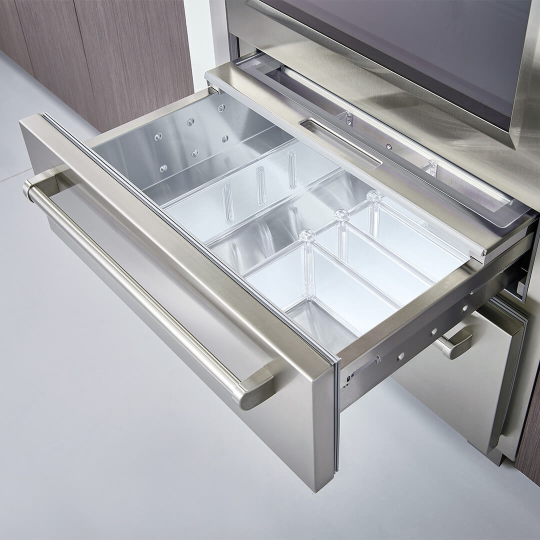 - Blokada temperatury i wilgotności dzięki zawiasom z miękkim domykiem i uszczelce magnetycznej na drzwiach i szufladach.