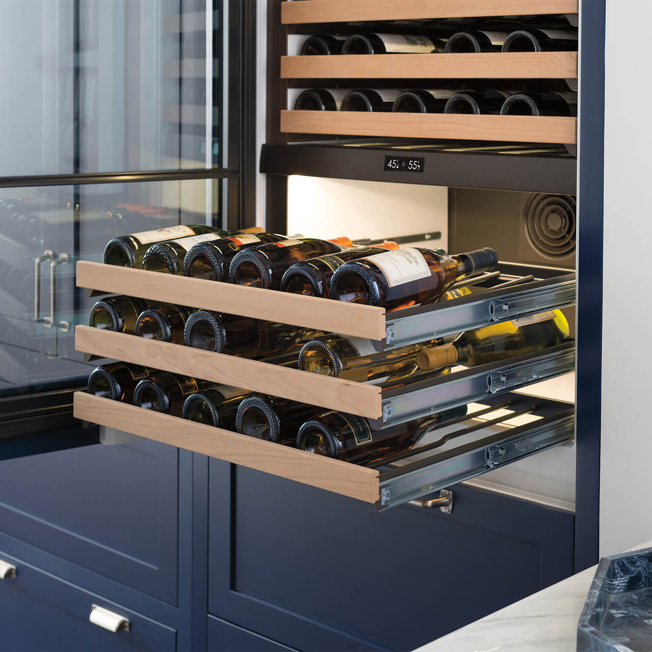 - Police jsou vybaveny výsuvy tak, abyste měli k lahvím snadný přístup