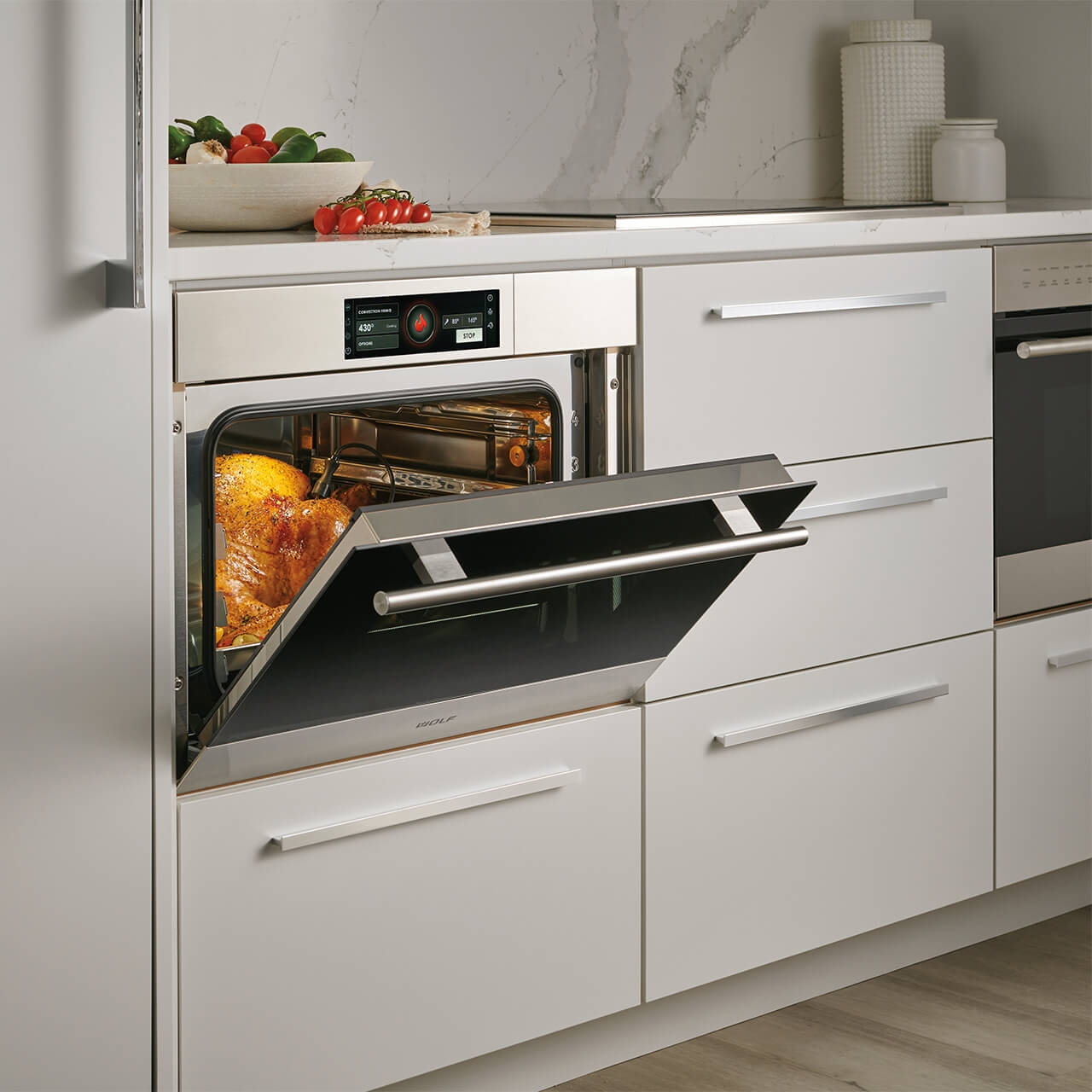 Jedná se možná o nejuniverzálnější pečící troubu/konvektomat na světě. Horkovzdušná parní trouba vám usnadní přípravu pokrmů. Na dosah ruky máte sílu páry a konvekčního tepla a širokou škálu režimů vaření, které vám pomohou vytvořit jakýkoli pokrm – křupavé zlatavé koláče, zapékané pokrmy nebo křehké steaky připravené metodou sous vide. Různé možnosti instalace a designu poskytují širokou škálu možností, zatímco nová estetická vylepšení zajišťují jednotný vzhled s ostatními produkty Wolf.