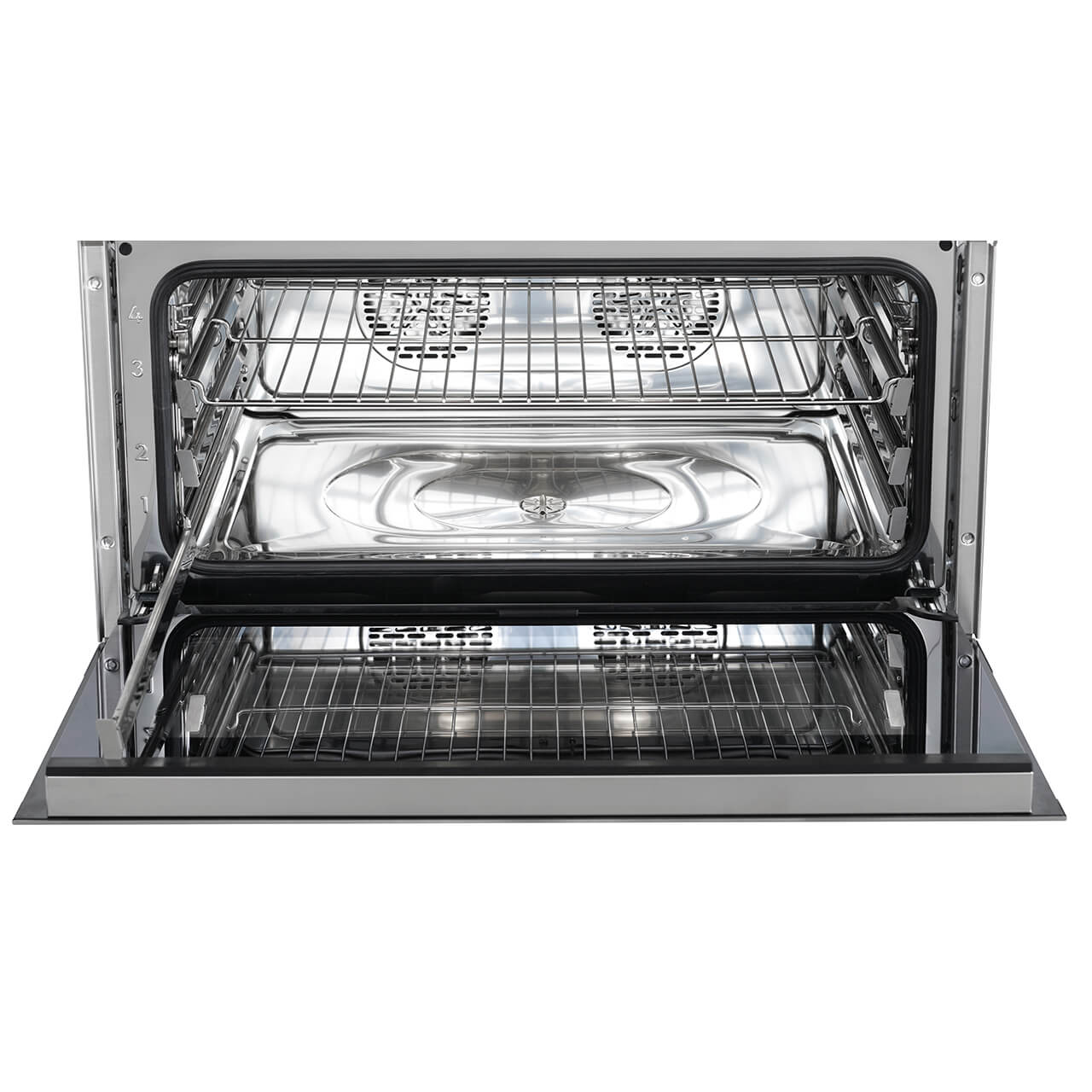 - Model s úhlopříčkou 76 cm nabízí velký prostor trouby o objemu 68 litrů a o 30 % více místa, což umožňuje umístit vedle sebe více jídel najednou. Systém dvojitého proudění vzduchu s výkonem 1889 W pro rovnoměrné pečení na více úrovních a konzistentní výsledky.