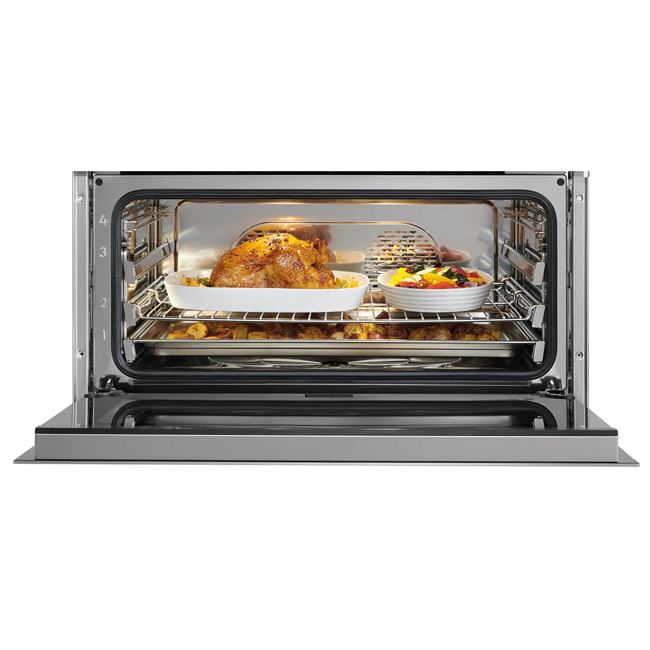 • Model šíře 76 cm nabízí velký prostor trouby o objemu 68 litrů a o 30 % více místa, což umožňuje umístit vedle sebe více jídel najednou. Duální konvekční systém s výkonem 1889 W pro rovnoměrné pečení na více úrovních a konzistentní výsledky.