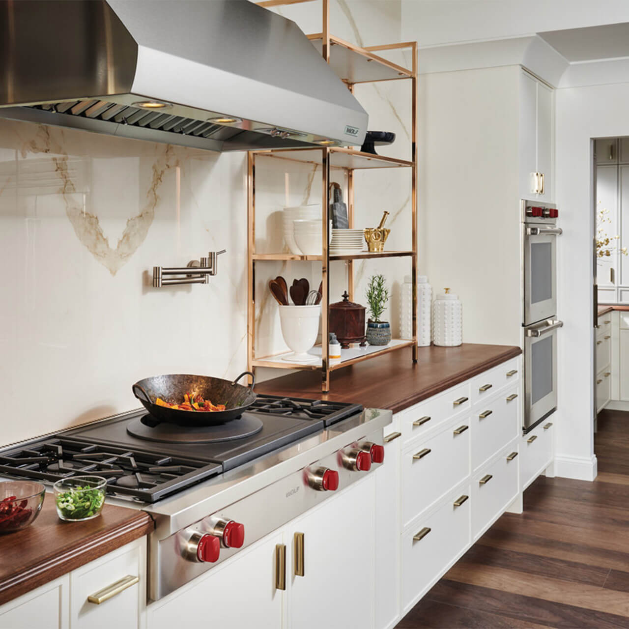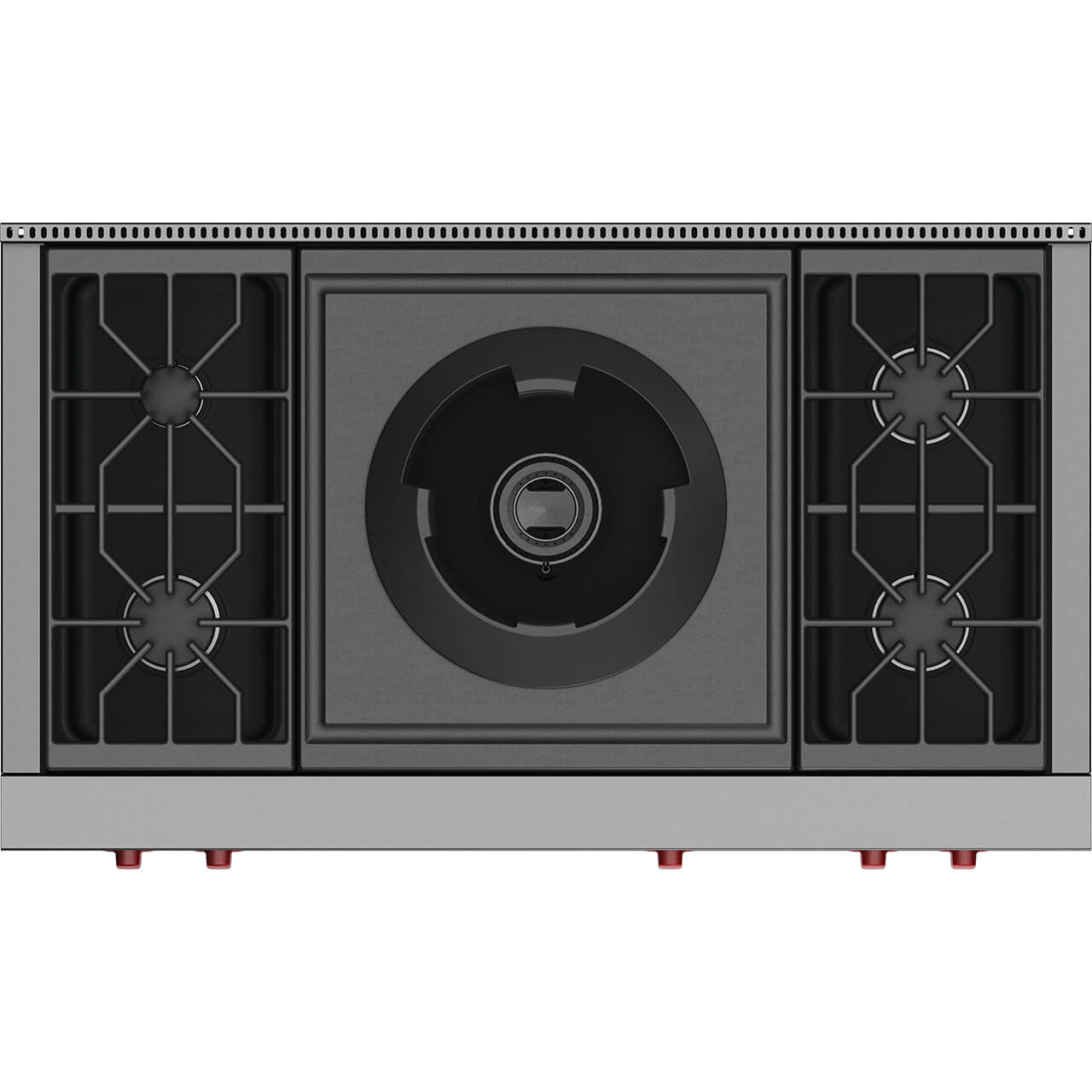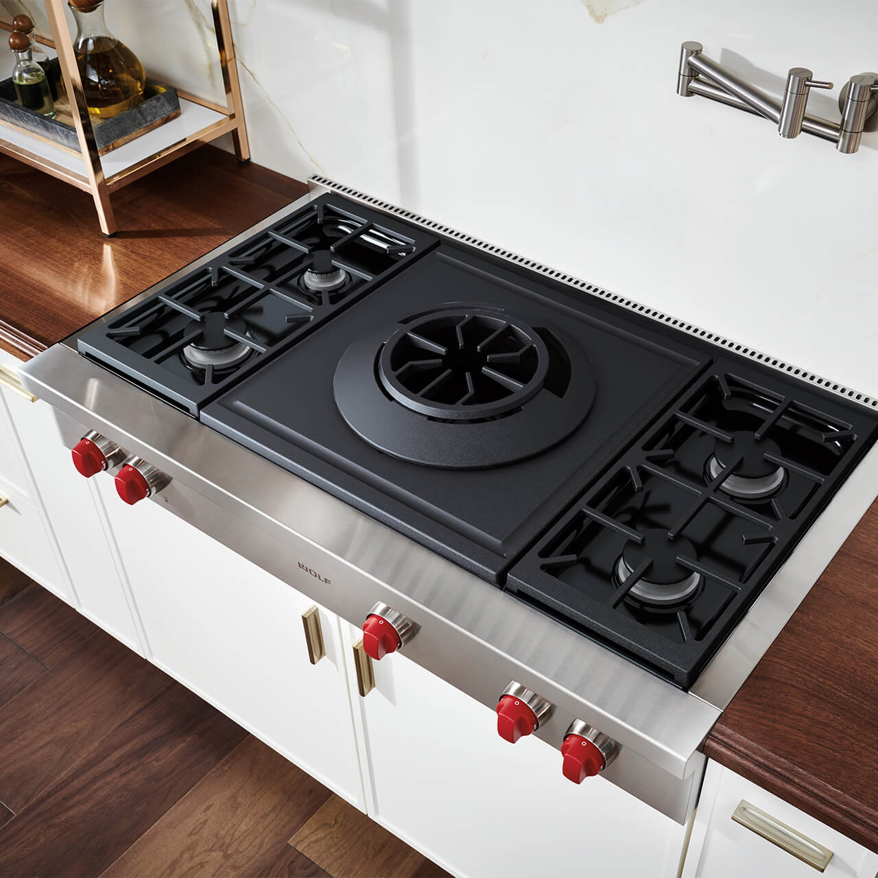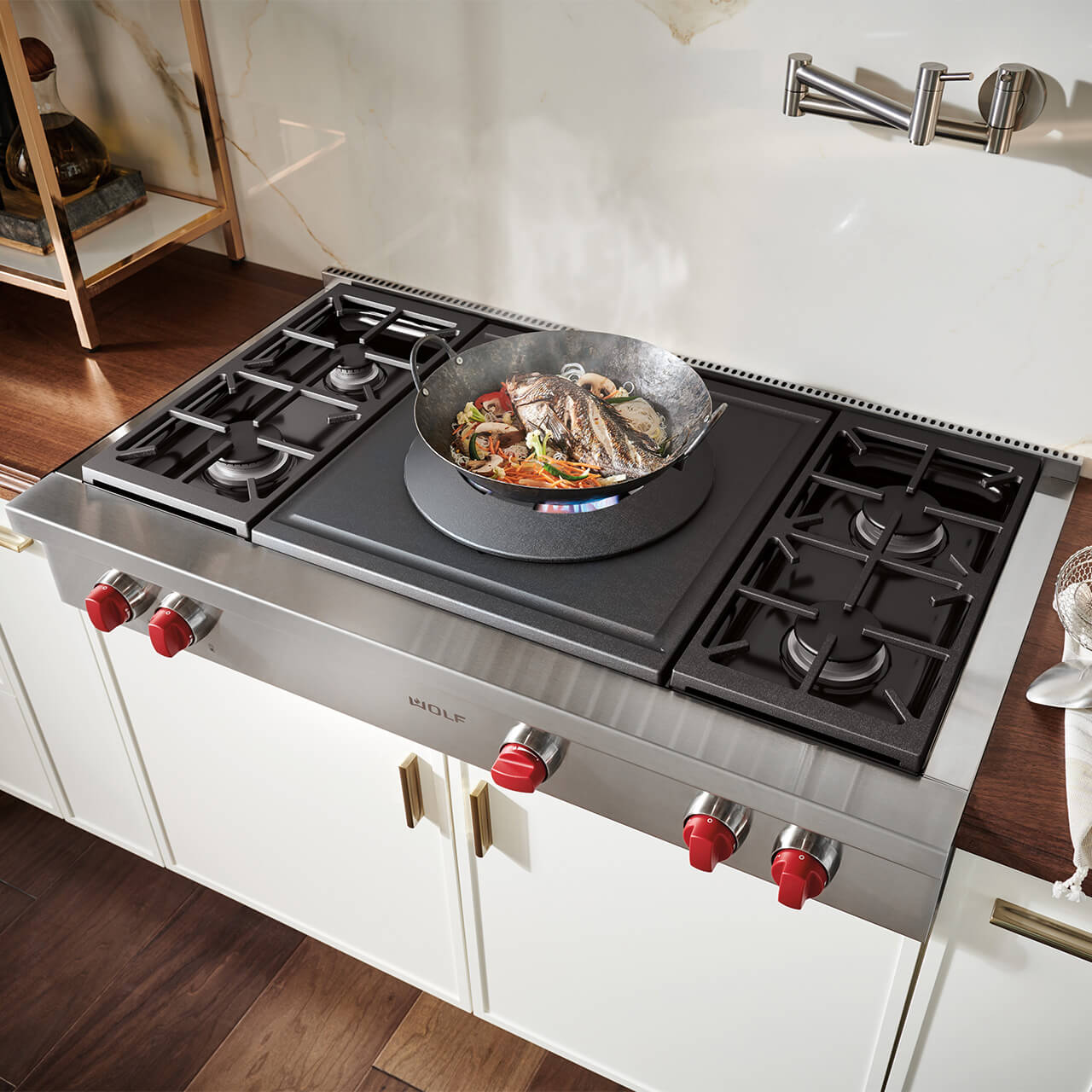 Skvělý spotřebič pro domácí kuchaře, který kombinuje výkon a ovládání dvojitých plynových hořáků Wolf s volitelnými moduly teppanyaki, plynovým grilem nebo WOK. Spotřebič dokonale doplňuje vestavné trouby a esteticky ladí s ostatními spotřebiči Sub-Zero a Wolf. Charakteristické ovládací knoflíky jsou k dispozici v různých barvách. K dispozici v šířkách 91 cm a 122 cm. Díky konstrukci z jednoho kusu nezerové oceli se snadno čistí.