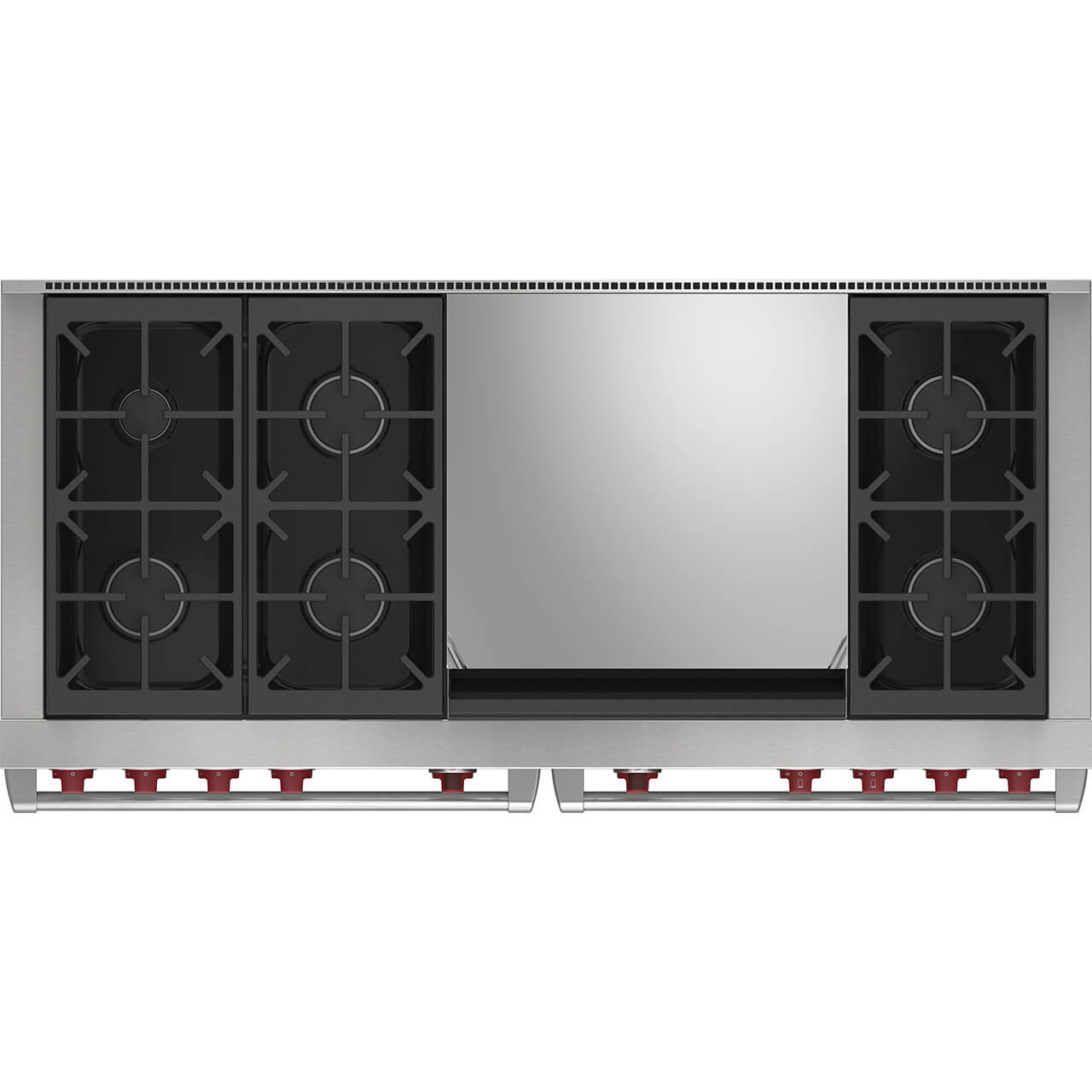Dosahujte vynikajících výsledků na všech úrovních. Patentované dvojité utěsněné plynové hořáky Wolf zajišťují konzistentní regulaci teploty od nejvyšší po nejnižší. Přizpůsobte si varnou desku pomocí nově nastavitelného grilu nebo přepracované desky teppanyaki.