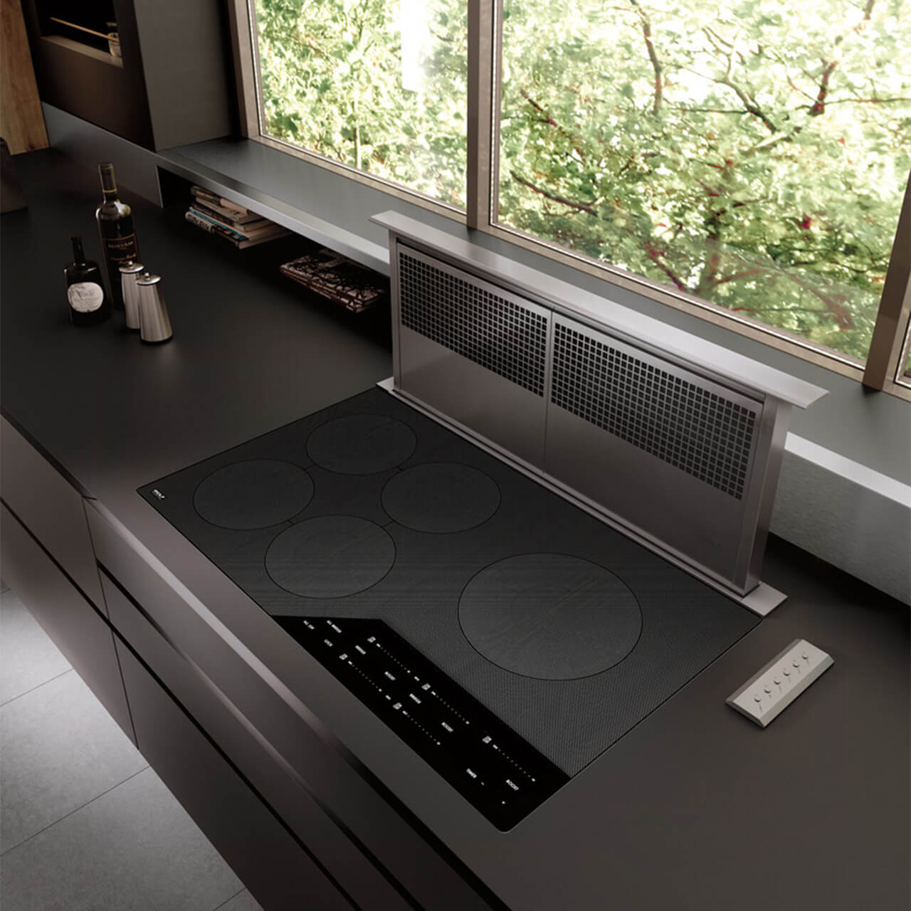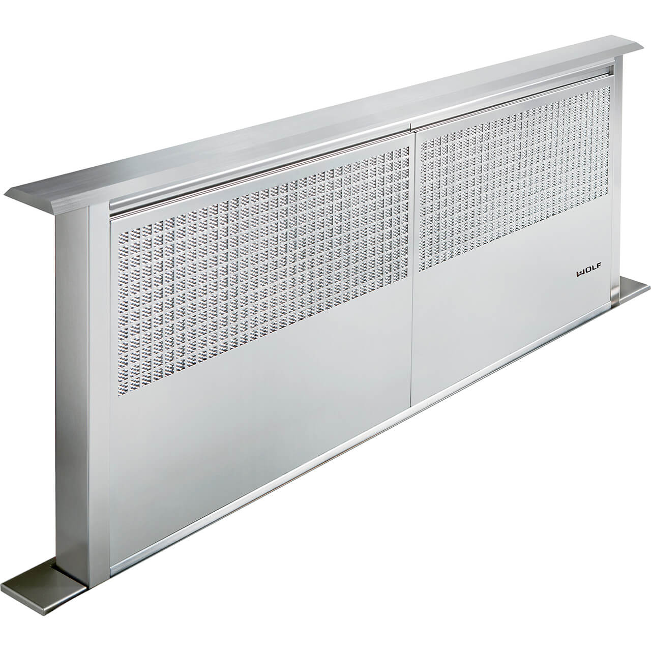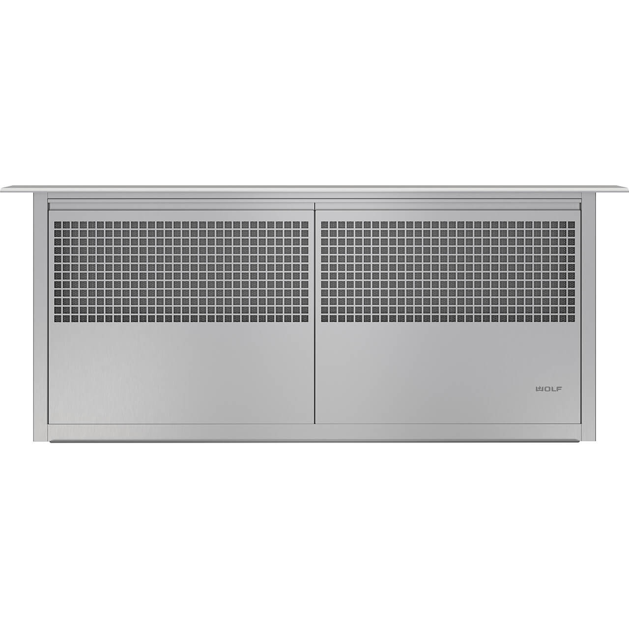 Když se nepoužívá, odsavač se zasune do pracovní desky Součástí balení je kabelové dálkové ovládání, které lze umístit až do vzdálenosti 3 metrů pod pracovní desku nebo do přilehlé skříňky. Indikátor vás informuje o tom, kdy je třeba použité filtry umýt v myčce Tvarovaná nerezová ocel dokonale ladí s většinou varných desek a sporáků Wolf.