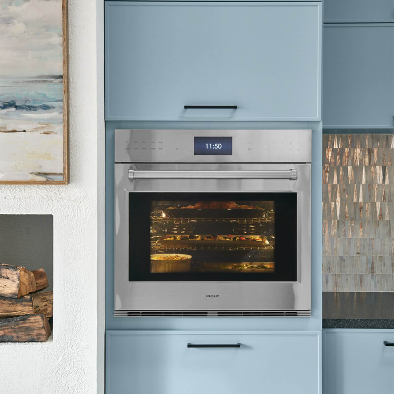 - Systém dvojitého proudění horkého vzduchu Wolf zajišťuje spolehlivě rovnoměrný ohřev, omezuje horká a studená místa a umožňuje konzistentní vaření na více úrovních.