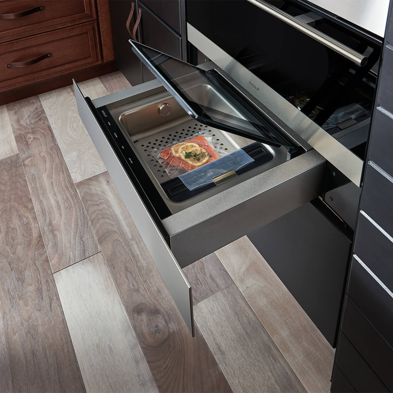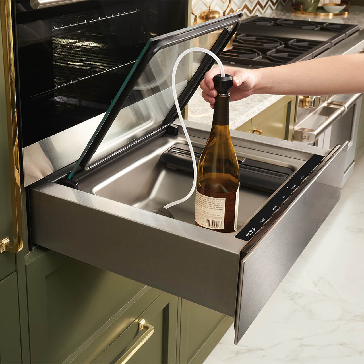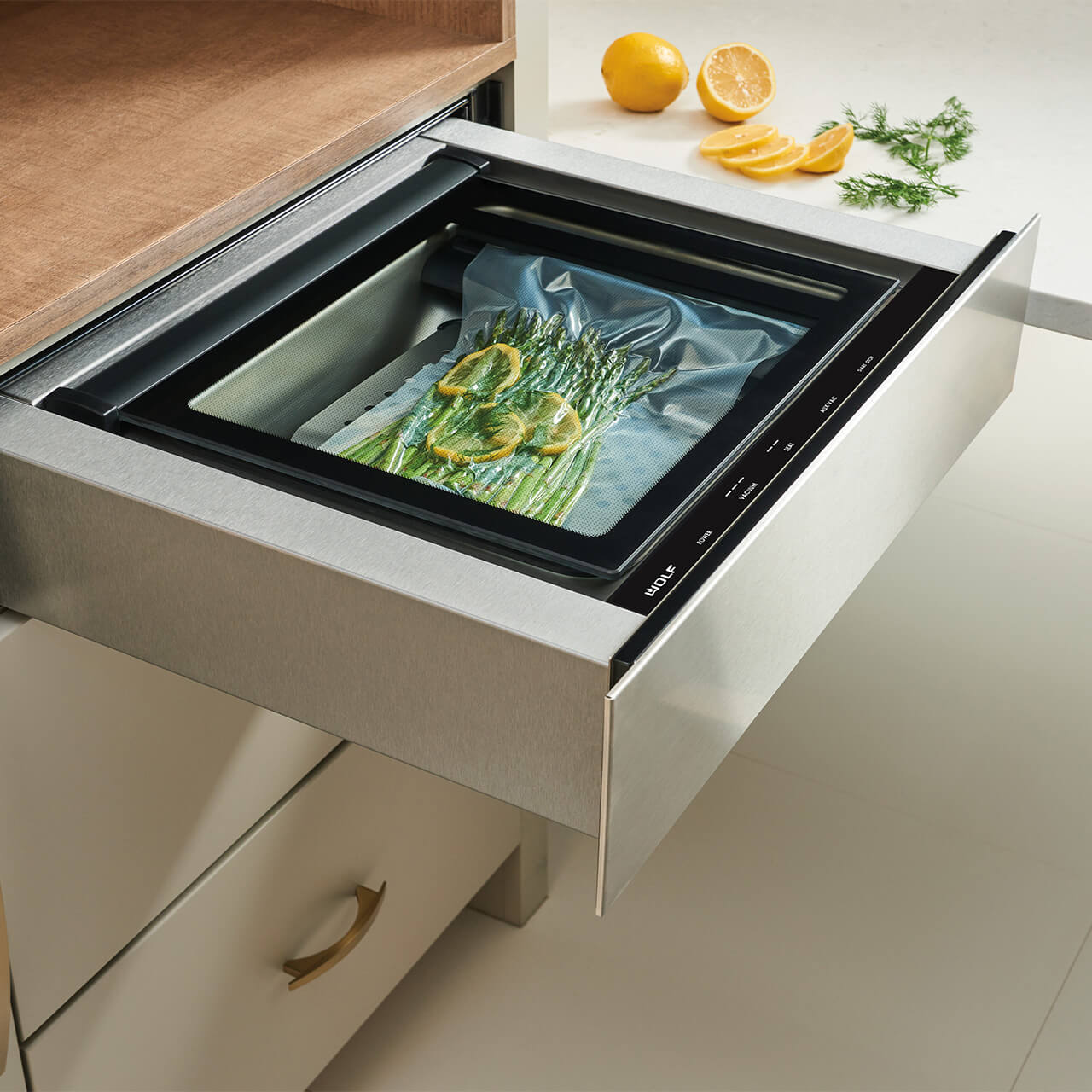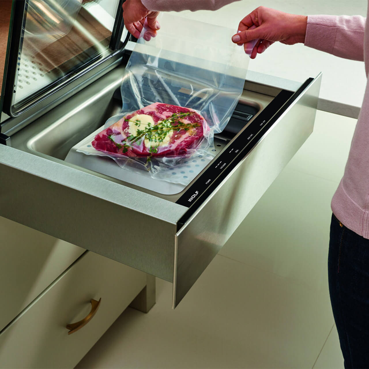 Vakuová zásuvka Wolf odsává vzduch a uzavírá potraviny nebo tekutiny, což usnadňuje skladování, marinování a vaření. Vychutnejte si nespočet nových kreativních možností v kuchyni, včetně trvale vynikajících výsledků vaření metodou sous vide, s přístrojem Wolf.