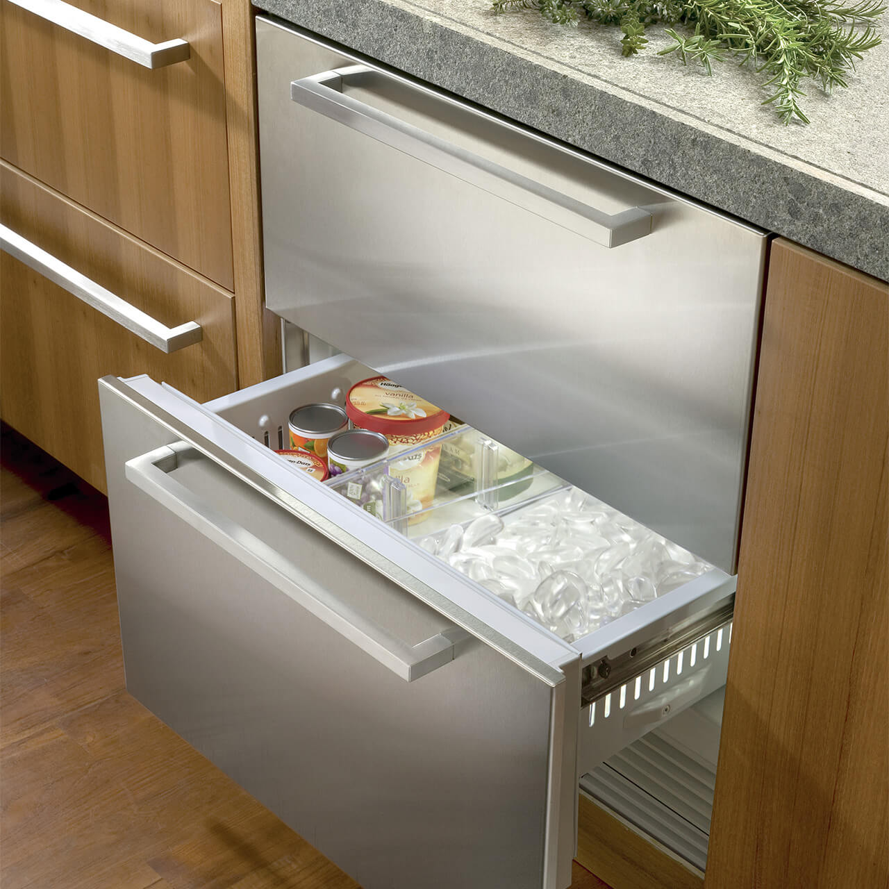 Zásuvkový mrazák Sub-Zero šíře 76 cm je jedním z našich nejprodávanějších modelů. Umístěte jej na vhodné místo, abyste měli přístup ke zmrazeným potravinám nebo kostek ledu z automatického výrobníku.